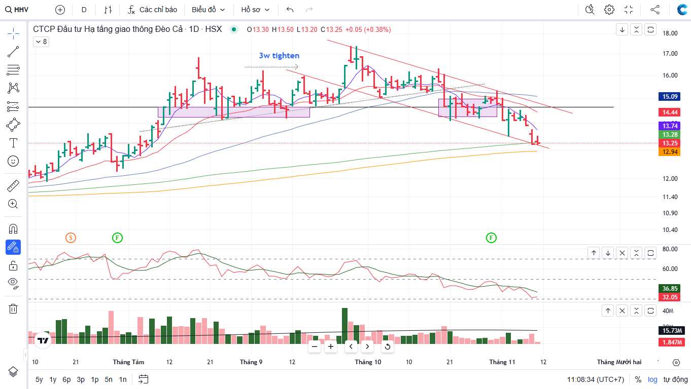 Trên biểu đồ kỹ thuật, HHV có RS=34, mức hoạt động yếu trên thị trường. HHV đang gặp hỗ trợ tại Ma150 ngày, tuy nhiên với hành động giá hiện tại của HHV, khả năng sẽ tìm về hỗ trợ sâu hơn ở Ma200 ngày, tức là ở điểm mua của nền cốc tay cầm trước đó. Nhóm đầu tư công nói chung đều đạt mức chỉnh 20%, và đang về lại các vùng hỗ trợ cứng. Lưu ý, mức điều chỉnh này là hợp lý (gấp 2 lần với mức điều chỉnh của thị trường) để cổ phiếu có thể xây nền sau đà tăng mạnh trước đó. Khuyến nghị nhà đầu tư đã có hàng mua tại nền trước đó tiếp tục nắm giữ.