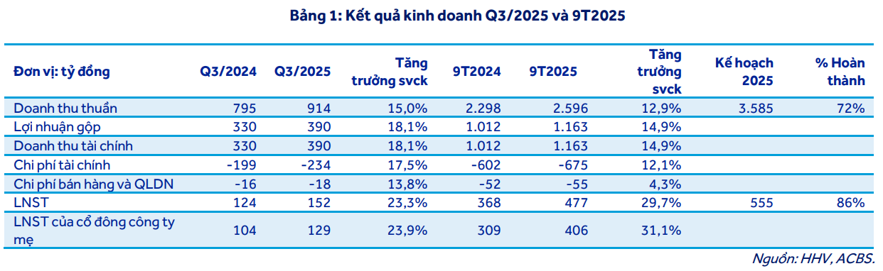 Lũy kế chín tháng đầu năm 2025, doanh thu đạt 2,596 tỷ đồng, tăng 13%, và lợi nhuận sau thuế đạt 406 tỷ đồng, tăng 31%. Mức hoàn thành so với kế hoạch lần lượt là 72% đối với doanh thu và 86% đối với lợi nhuận, tương ứng 67% và 79% dự phóng của ACBS.