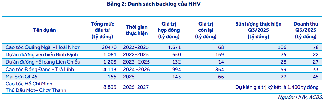 Tính đến cuối quý III năm 2025, giá trị hợp đồng xây lắp chưa ghi nhận doanh thu (backlog) của HHV đạt hơn 2,500 tỷ đồng, tương đương 2.5 lần doanh thu mảng xây lắp năm 2024. Danh mục backlog gồm nhiều dự án chiến lược: cao tốc Quảng Ngãi – Hoài Nhơn tổng mức đầu tư 20,470 tỷ đồng, cao tốc Đồng Đăng – Trà Lĩnh 14,113 tỷ đồng, đường ven biển Bình Định 1.081 tỷ đồng, và đường nối cảng Liên Chiểu 1,203 tỷ đồng. Ngoài ra, công ty dự kiến ký kết thêm hợp đồng trị giá khoảng 1,400 tỷ đồng cho dự án cao tốc Hồ Chí Minh – Thủ Dầu Một – Chơn Thành giai đoạn 2025-2027.