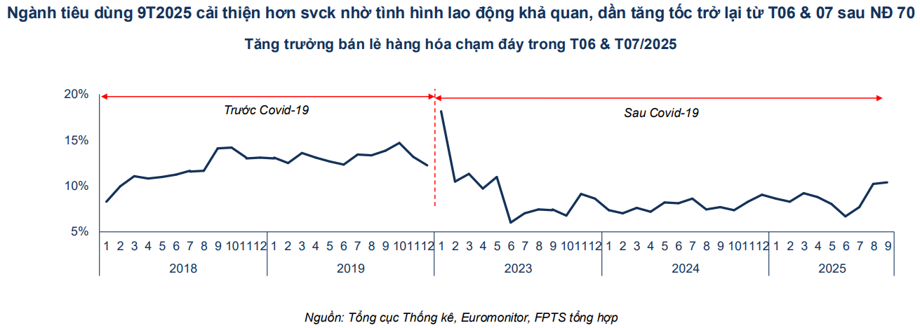 Trong 9T.2025, ngành tiêu dùng Việt Nam chứng kiến một hành trình chuyển mình rõ nét, từ giai đoạn điều chỉnh mạnh giữa năm đến sự phục hồi vững chắc vào cuối quý III. Dưới tác động ngắn hạn của Nghị định 70/2025/NĐ-CP, quy định bắt buộc hộ kinh doanh có doanh thu từ một tỷ đồng/năm trở lên phải chuyển sang hình thức kê khai thuế và sử dụng hóa đơn điện tử – thị trường tiêu dùng từng rơi vào giai đoạn “hụt hơi” trong tháng 6 và 7. Tuy nhiên, khi doanh nghiệp và hộ kinh doanh dần thích ứng, sức mua nhanh chóng trở lại quỹ đạo tăng trưởng, thể hiện một nền tảng tiêu dùng nội địa ngày càng linh hoạt và bền bỉ.