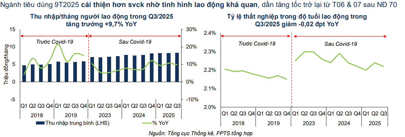 Sức mua phục hồi được củng cố bởi bức tranh lao động tích cực. Thu nhập bình quân tháng của người lao động tăng 9.9% so với cùng kỳ, trong khi tỷ lệ thất nghiệp giảm xuống còn 2.22%. Dù chưa chạm lại mức trước đại dịch (2.18%), sự cải thiện này cho thấy niềm tin tiêu dùng đã quay trở lại cùng với sự ổn định của thị trường việc làm.