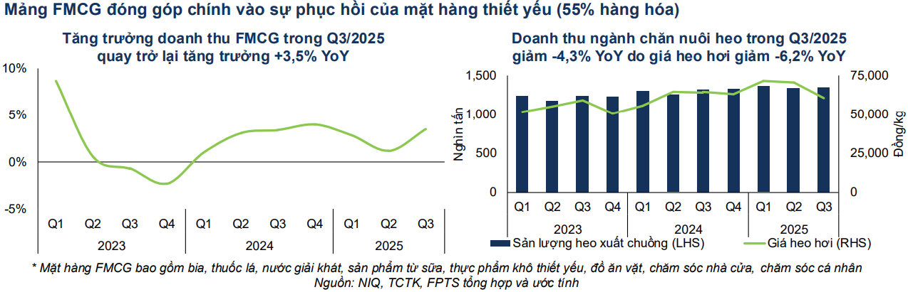 Trong cơ cấu bán lẻ, nhóm hàng thiết yếu chiếm 55% tổng doanh thu với hai động lực chính là hàng FMCG và hàng tươi sống. Doanh thu FMCG phục hồi mạnh trong quý III, (+3.5% YoY), gấp gần 3 lần tốc độ của quý II, nhờ các hộ kinh doanh dần làm quen với hệ thống hóa đơn điện tử. Ngược lại, nhóm hàng tươi sống giảm nhẹ do doanh thu chăn nuôi heo giảm 4.3%, kéo theo giá heo hơi giảm 6.2% bởi tác động của dịch ASF và hoàn lưu bão kéo dài làm dư cung cục bộ.