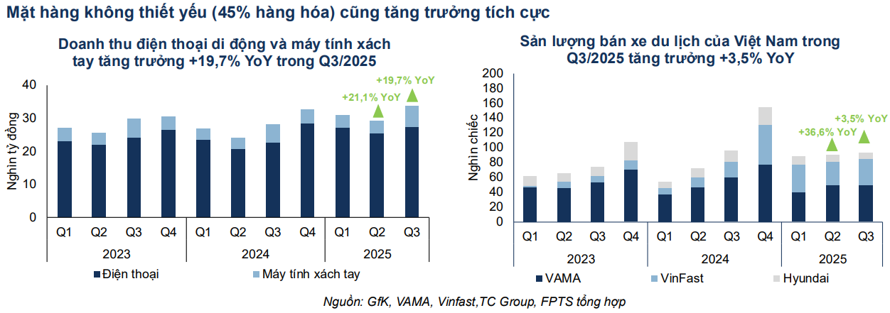 Trái ngược với nhóm hàng thiết yếu, hàng không thiết yếu, vốn chịu ảnh hưởng mạnh trong năm 2023, lại trở thành điểm sáng trong quý III/2025. Doanh thu điện thoại và máy tính xách tay tăng mạnh 19.7% so với cùng kỳ, hưởng lợi từ nhu cầu thay thế sản phẩm, sự ra mắt loạt thiết bị tích hợp trí tuệ nhân tạo và việc Windows 10 ngừng hỗ trợ từ ngày 14/10/2025. Doanh số xe du lịch cũng tăng 3.5% khi xe điện VinFast tiếp tục chiếm ưu thế so với xe xăng nhờ thuế tiêu thụ đặc biệt và phí trước bạ thấp hơn, cùng chi phí vận hành hiệu quả hơn.
