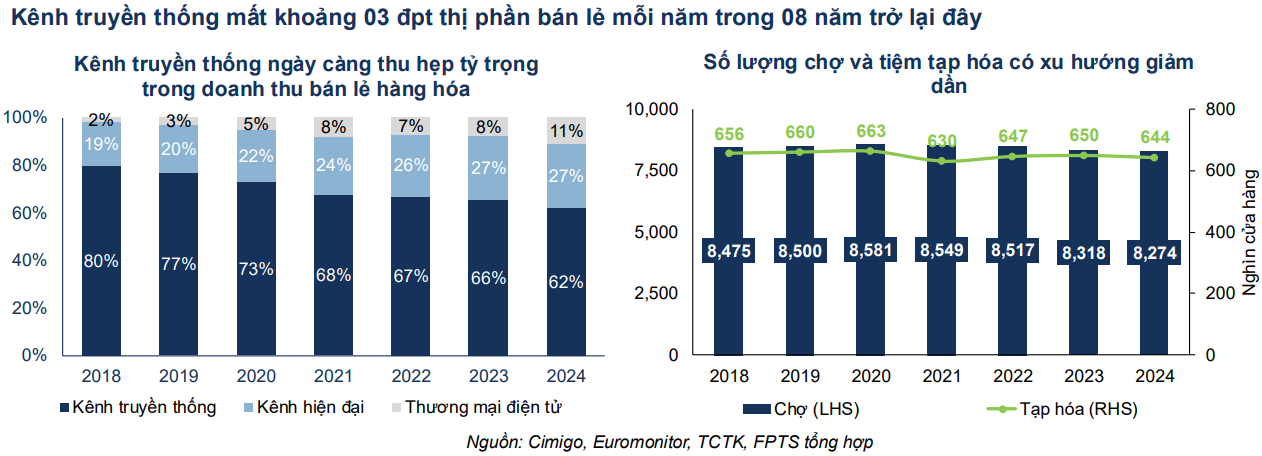 Ngoài các yếu tố vĩ mô, hành vi tiêu dùng đang thay đổi căn bản, tạo nên xu hướng chuyển dịch mạnh từ kênh truyền thống sang hiện đại và trực tuyến. Trong giai đoạn 2018-2024, thị phần kênh truyền thống giảm từ 92% xuống 87% trong lĩnh vực thực phẩm, cùng với sự sụt giảm số lượng chợ và cửa hàng tạp hóa. Tỷ trọng kênh truyền thống tại Việt Nam vẫn cao hơn nhiều so với Indonesia (77%), Philippines (71%) hay Thái Lan (49%), cho thấy dư địa tăng trưởng đáng kể cho các mô hình bán lẻ hiện đại.