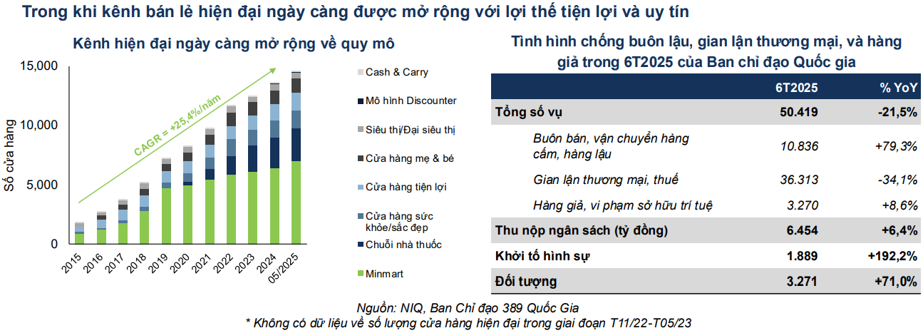 Kênh bán lẻ hiện đại được mục sản phẩm mở rộng nhanh nhờ lợi thế về uy tín, danh đa dạng và trải nghiệm mua sắm tiện lợi. Song song đó, chính phủ tăng cường kiểm soát hàng lậu và hàng giả: trong nửa đầu 2025, dù tổng số vụ xử lý giảm 21.5% so với cùng kỳ, nhưng số đối tượng bị khởi tố hình sự tăng tới 192.2%, phản ánh nỗ lực nâng cao tính minh bạch của thị trường.