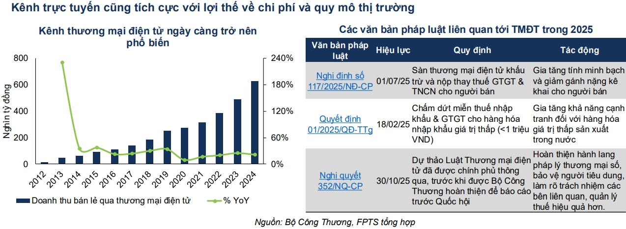 Thương mại điện tử trở thành mũi tăng trưởng chủ đạo. Doanh thu bán lẻ trực tuyến tăng trung bình 37.3% mỗi năm, gấp bốn lần tốc độ toàn ngành, nhờ chi phí vận hành thấp và khả năng tiếp cận khách hàng rộng. Năm 2025, loạt văn bản pháp lý như Nghị định 117/2025/NĐ-CP, Quyết định 01/2025/QĐ-TTg và Nghị quyết 352/NQ-CP giúp hoàn thiện hành lang pháp lý, tạo môi trường cạnh tranh công bằng và thúc đẩy minh bạch trong hoạt động thương mại số.