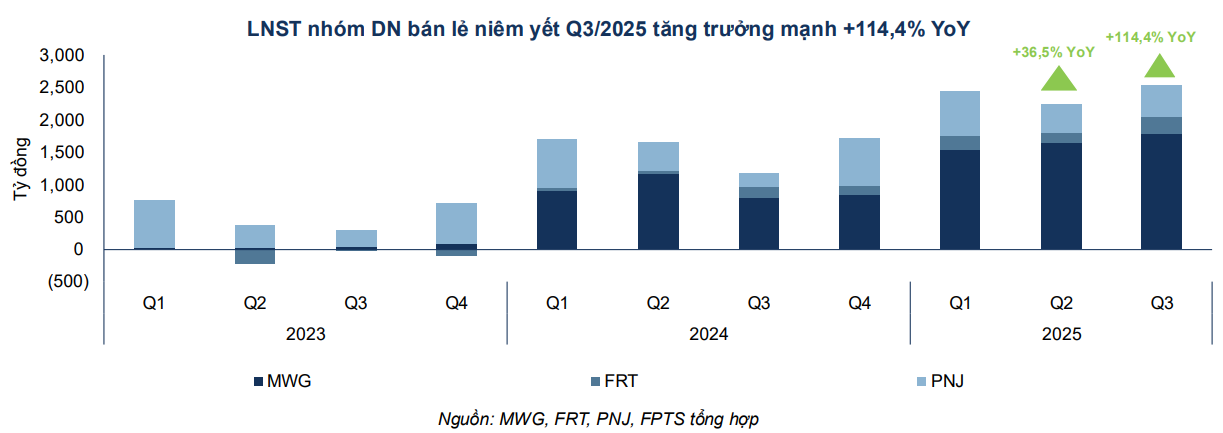 Nhóm doanh nghiệp bán lẻ niêm yết ghi nhận quý tăng trưởng nổi bật. Doanh thu mảng hàng không thiết yếu tăng 16.4% nhờ nhu cầu nâng cấp thiết bị điện tử và đóng góp từ chuỗi Thế Giới Di Động, Điện Máy Xanh. Mảng hàng thiết yếu tăng 20.1%, dẫn dắt bởi sự mở rộng của chuỗi Bách Hóa Xanh, WinCommerce và Long Châu. Lợi nhuận sau thuế toàn nhóm tăng mạnh 114.4% so với cùng kỳ, phản ánh hiệu quả hoạt động và khả năng tận dụng quy mô vượt trội của các doanh nghiệp lớn.