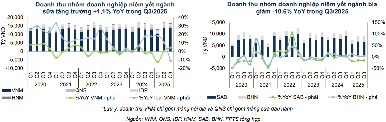 Trái lại, nhóm thực phẩm ghi nhận sự phân hóa rõ rệt. Doanh thu ngành sữa tăng nhẹ 1.1%, nhờ Vinamilk phục hồi kênh truyền thống (+3.9%) và đẩy mạnh kênh hiện đại (+11%), trong khi các doanh nghiệp khác như IDP, HNM giảm 11.2%. Ngành bia suy giảm 10.6% khi Sabeco giảm 16.1% do yếu tố kế toán và cắt giảm chi phí quảng bá. Nhóm FMCG khác tăng 18.1% so với quý trước nhưng vẫn giảm 5.1% so với cùng kỳ, do quá trình tái cơ cấu kênh phân phối của Masan Consumer (MCH). Lợi nhuận toàn nhóm thực phẩm giảm 8.1%, chịu áp lực từ giá nguyên liệu tăng (sữa bột, đậu nành, vỏ nhôm) và chi phí marketing leo thang.