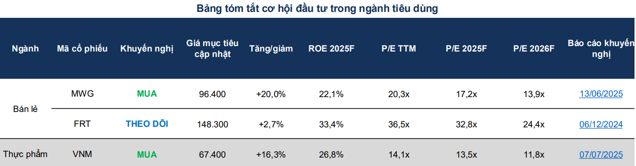 MWG được khuyến nghị “Mua” với giá mục tiêu 96,400 đồng/cổ phiếu, dự báo doanh thu 2025 đạt 159,834 tỷ đồng (+19% YoY) và lợi nhuận sau thuế 6,893 tỷ đồng (+84.7%). Chuỗi Bách Hóa Xanh được kỳ vọng mở rộng lên 2,500 cửa hàng trong năm 2025, với dư địa lớn ở miền Trung và miền Bắc.