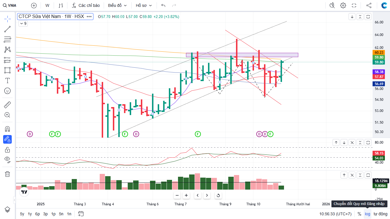 BSC (10.11.2025) giữ khuyến nghị MUA, giá mục tiêu 64,500 đồng/cổ phiếu, tương ứng upside +20%, đã bao gồm 4,350 đồng/cổ phiếu cổ tức tiền mặt (tỷ suất cổ tức 7.5%, cao hơn lãi suất tiền gửi trung bình). BSC cho rằng VNM đang giao dịch ở mức P/E forward 2025 = 15 lần, thấp hơn trung bình 17–18 lần của giai đoạn 2023–2024, phản ánh định giá hấp dẫn trong bối cảnh kết quả kinh doanh đang hồi phục.