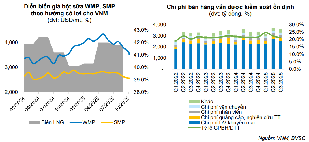 Tỷ lệ chi phí bán hàng và quản lý (SG&A/DTT) giảm xuống 23.8%, thấp hơn 0.4 điểm phần trăm so với cùng kỳ, nhờ kiểm soát hiệu quả chi phí marketing, tối ưu vận hành và tăng năng suất lao động. Theo BVSC, VNM đã chốt giá nguyên liệu đầu vào cho quý 4/2025 và quý 1/2026 ở mức thấp, giúp đảm bảo ổn định chi phí sản xuất trong ngắn hạn.
