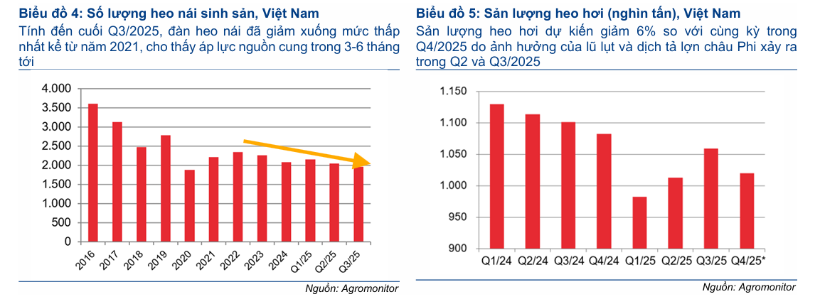 Từ cuối tháng 9 đến giữa tháng 10, các cơn bão và áp thấp nhiệt đới đã gây ngập lụt trên diện rộng, khiến nhiều hộ chăn nuôi buộc phải bán tháo đàn vật nuôi trong Q3, gây ra áp lực giảm giá tạm thời. Tuy nhiên, tác động dài hạn là việc gián đoạn chuỗi cung ứng và sự suy giảm mạnh của đàn heo nái, vốn đã giảm xuống mức thấp nhất kể từ năm 2021. Việc tái đàn đòi hỏi thời gian, dẫn đến nguồn cung thịt heo trong nước dự kiến sẽ thắt chặt trong 3-6 tháng tới, trùng với mùa tiêu thụ cao điểm trước Tết Nguyên đán.