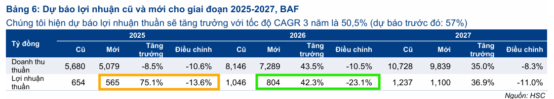 Mặc dù có triển vọng tích cực về giá bán, HSC quyết định điều chỉnh giảm bình quân 15.9% dự báo lợi nhuận thuần giai đoạn 2025–2027. Việc giảm dự báo này chủ yếu nhằm tăng giả định về chi phí tài chính và chi phí quản lý & bán hàng, phản ánh quan điểm thận trọng hơn trước rủi ro thiên tai ngày càng gia tăng.
