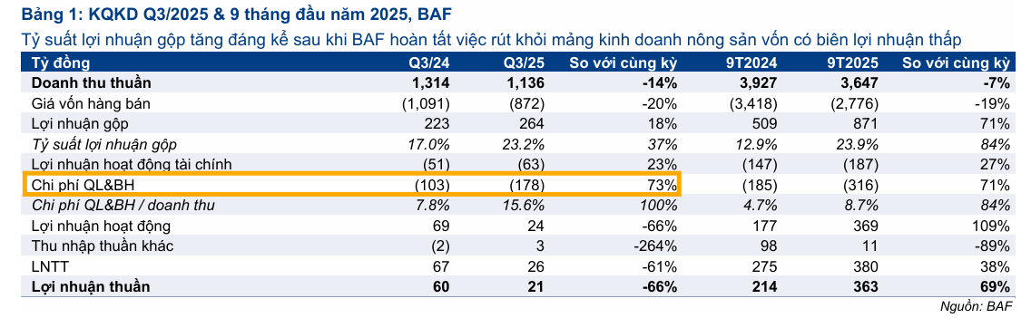 BAF lợi nhuận quý 3/2025 giảm mạnh: LNST chỉ đạt 21 tỷ đồng (-66% YoY) do chi phí quản lý & bán hàng tăng đột biến bởi lũ lụt và dịch bệnh, dù doanh thu mảng chăn nuôi tăng 33%.
