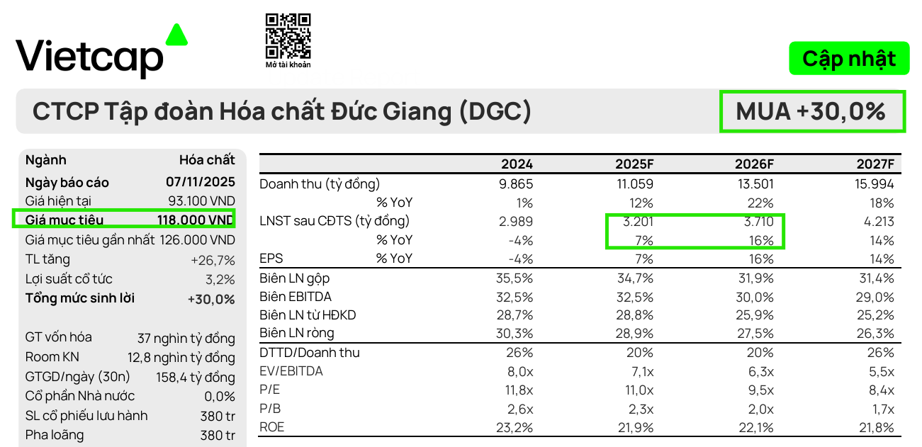 Vietcap (7.11.2025) quyết định điều chỉnh giảm 6% giá mục tiêu đối với cổ phiếu CTCP Tập đoàn Hóa chất Đức Giang (DGC) xuống mức 118,000 đồng/cổ phiếu, nhưng vẫn giữ nguyên khuyến nghị MUA. Mức giá mục tiêu mới thấp hơn này chủ yếu phản ánh việc điều chỉnh giảm 8% dự báo EBITDA cốt lõi năm 2026 và hạ bội số EV/EBITDA mục tiêu xuống 8.0 lần (so với mức 9.0 lần trước đó).