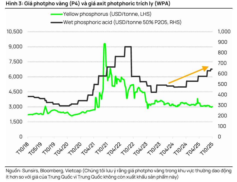 Đối với mảng Phốt pho nông nghiệp (AP), Vietcap hiện dự báo giá bán AP trung bình sẽ tăng 22% so với cùng kỳ trong năm 2025, nhưng sản lượng lại giảm 20% do kết quả kinh doanh 9 tháng yếu hơn dự kiến và việc DGC chuyển đổi 100% sản xuất axit phốt pho ướt (WPA) sang sản xuất phân bón trong bối cảnh giá phân bón thuận lợi.