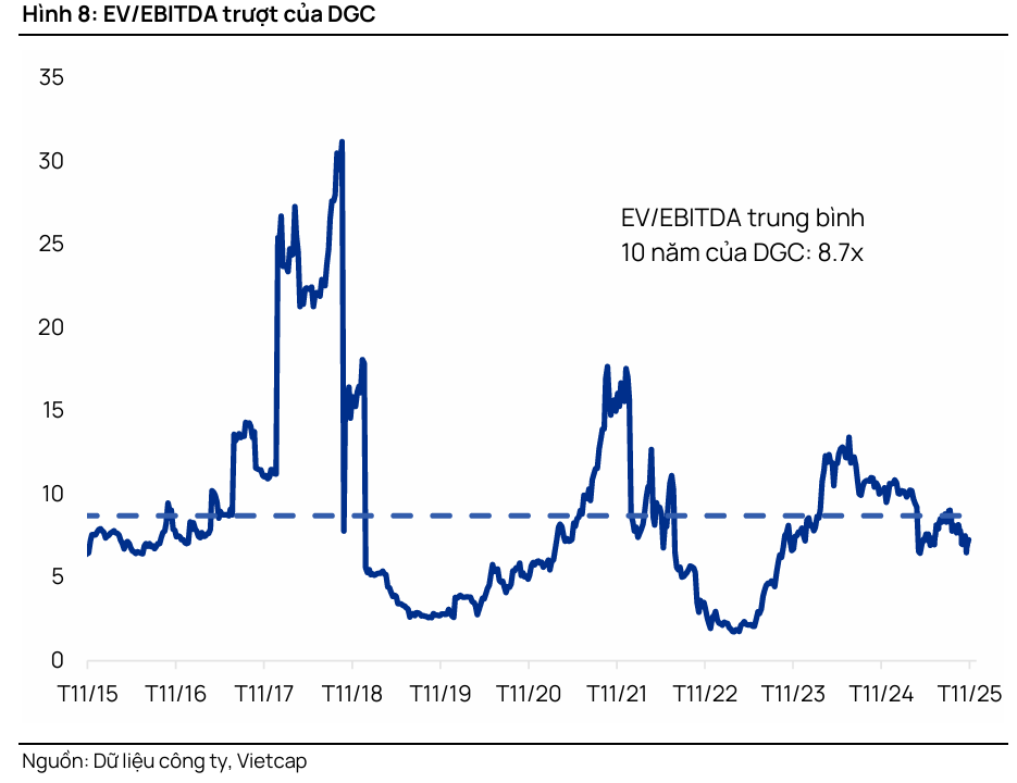 Hiện tại, cổ phiếu DGC đang giao dịch ở mức EV/EBITDA các năm 2025/2026/2027 lần lượt là 7.1 lần/6.3 lần/5.5 lần, thấp hơn đáng kể so với mức trung bình 10 năm của công ty là 8.7 lần.