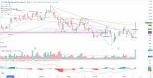 Trên đồ thị, RS của DGC là 76, đang hoạt động khá tốt trong thời gian qua. Ngày 13.11.2025, DGC tăng trần và có điểm mua Pocket Pivot.