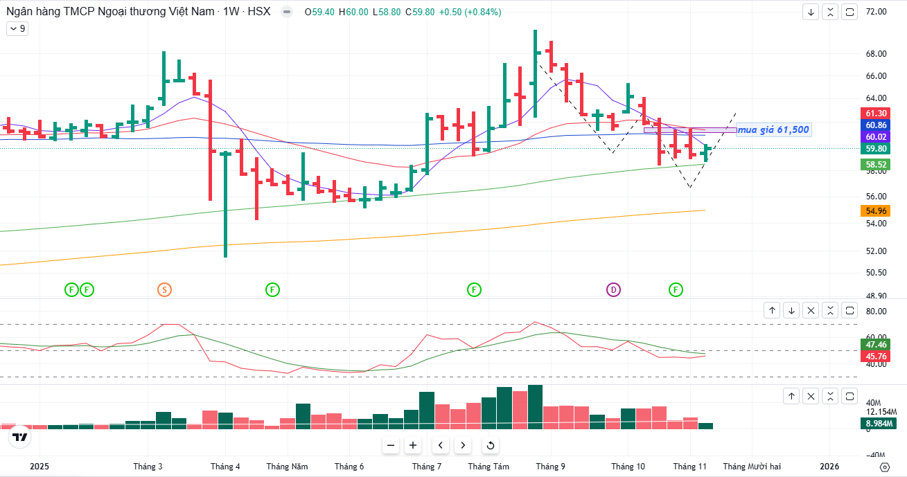 Trên biểu đồ kỹ thuật, VCB có RS=37, mức hoạt động yếu trên thị trường. VCB đang có mẫu hình Hai Đáy (W), và cũng sớm xây nền giá trước thị trường chung, khuyến nghị quan sát điểm mua sớm tại giá 61,500 đồng.