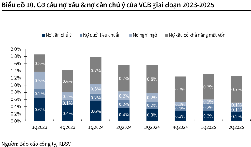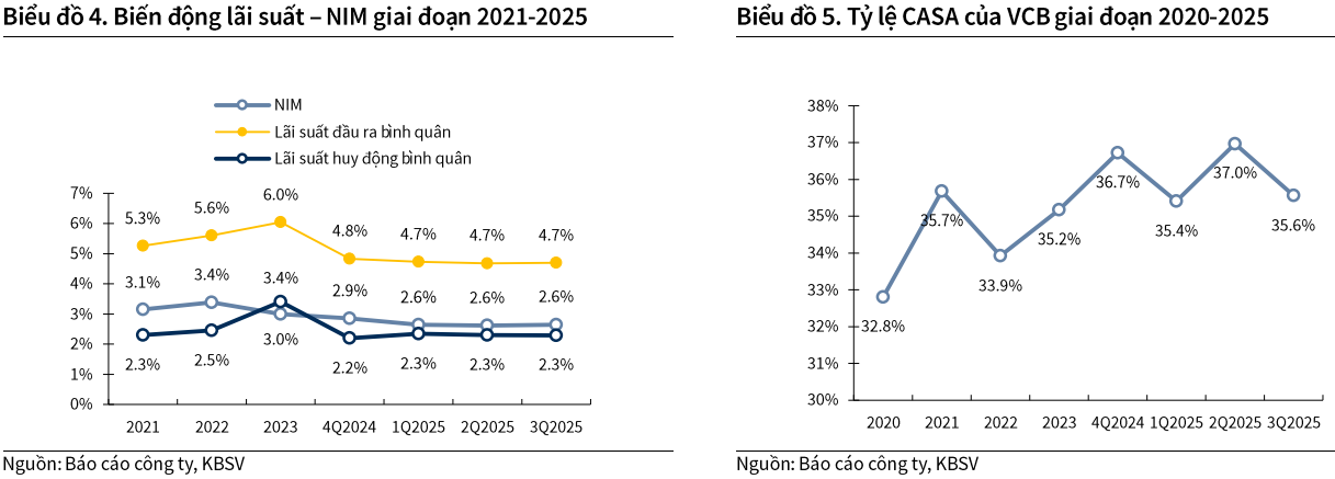 KBSV dự báo NIM năm 2025 đạt 2.58% và năm 2026 nhích nhẹ lên 2.62%, tương ứng với giai đoạn tạo đáy và hồi phục. Mặc dù chi phí huy động dự kiến tăng 50-100 điểm cơ bản do áp lực thanh khoản và tỷ giá, Vietcombank vẫn hưởng lợi nhờ tỷ lệ tiền gửi không kỳ hạn (CASA) duy trì ở mức cao 35-36%, cùng chi phí vốn thấp nhất toàn ngành.
