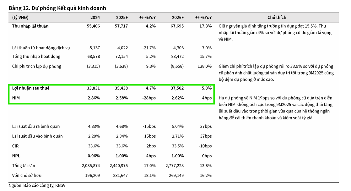 KBSV (13.11.2025) đưa ra khuyến nghị MUA và khẳng định mức giá hợp lý cho cổ phiếu VCB trong năm 2026 là 76,500 VND/cổ phiếu (Tăng trưởng kỳ vọng: 28.6%). Mức định giá này phản ánh vị thế đầu ngành, chất lượng tài sản vượt trội và triển vọng tăng trưởng tín dụng ổn định của VCB trong bối cảnh kinh tế phục hồi. KBSV dự phóng LNST năm 2025 tăng trưởng 4.7% đạt 35,438 tỷ và tiếp tục tăng trưởng 5.8% trong năm 2026, đạt 37,502 tỷ.