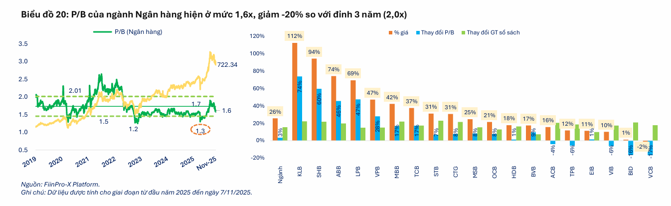 - Định giá quanh trung bình 5 năm: Ngân hàng (P/B 1.6x) và Chứng khoán, nhưng ngành Ngân hàng đang trong giai đoạn lợi nhuận chững lại.