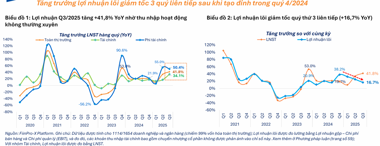 Tuy nhiên, FiinTrade nhấn mạnh câu chuyện về Lợi nhuận lõi (lợi nhuận từ hoạt động kinh doanh cốt lõi) đã được đề cập trước đó. Mức tăng trưởng cao này chủ yếu đến từ các khoản thu nhập không thường xuyên của nhiều doanh nghiệp đầu ngành như VIC, VCG, GEE, GEX, VGI và MWG (bao gồm thu nhập tài chính, bán tài sản, lãi tỷ giá, và hoàn nhập dự phòng).