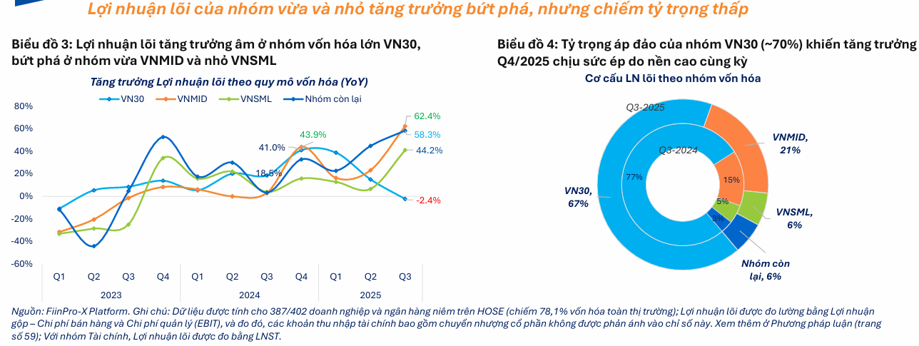 - Phân hóa rõ rệt theo ngành và vốn hóa: nhóm VN30 giảm nhẹ lợi nhuận lõi (-2.4% YoY) do Ngân hàng và Bất động sản kém tích cực; ngược lại nhóm vốn hóa vừa và nhỏ (VNMID, VNSML) tăng trưởng vượt trội (+62.4% và +44.2% YoY).