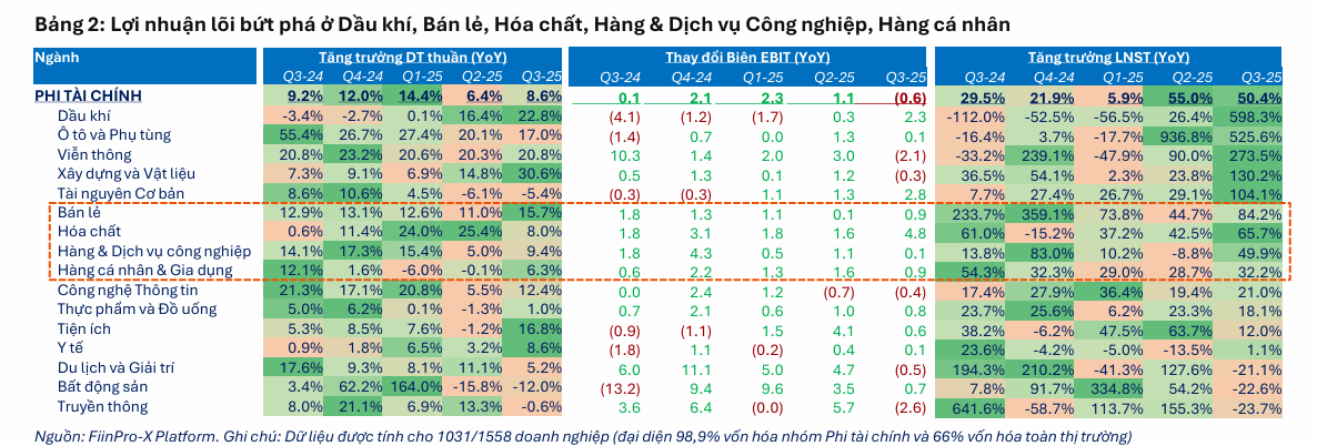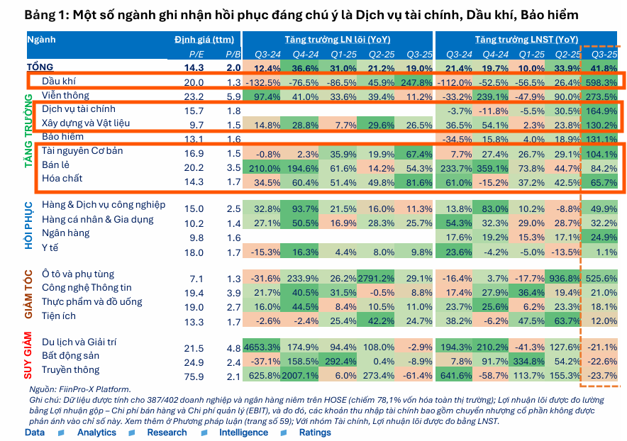 Tăng trưởng cao được ghi nhận ở các ngành Dầu khí (PVS, PVD, TOS) nhờ nền so sánh thấp và sự hồi phục ở chuỗi khai thác – dịch vụ; Viễn thông (VGI); Vật liệu & Xây dựng (VCG, SJG, BMP, PC1, CTD); Bán lẻ (MWG, FRT) nhờ cải thiện hiệu quả vận hành và hồi phục sức mua; và Bảo hiểm (BVH, PVI, MIG) trên nền so sánh thấp. Ngành Hàng cá nhân (PNJ) bứt tốc nhờ biên lợi nhuận cải thiện mạnh mẽ.