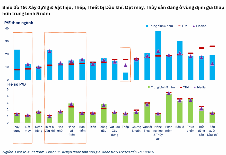 Định giá thấp hơn trung bình 5 năm: Các ngành có tính chu kỳ cao như Xây dựng, Thiết bị Dầu khí, nhóm Xuất khẩu (Dệt may, Thủy sản, Hóa chất) và Bảo hiểm. Đây cũng là những ngành đã đạt mức tăng trưởng cao về lợi nhuận lõi trong quý 3, cho thấy dư địa tăng trưởng định giá.