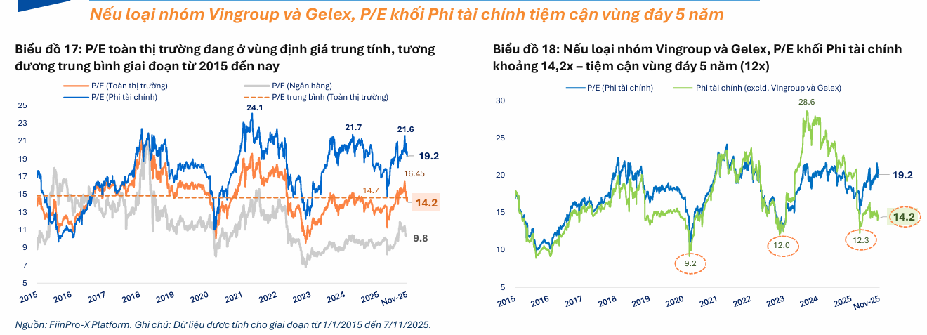 Đối với nhóm Phi tài chính, P/E hiện tại là 19.2x, nhưng nếu loại trừ ảnh hưởng của nhóm Vingroup và Gelex (các cổ phiếu có mức tăng giá vượt trội), P/E của nhóm còn lại chỉ khoảng 14.2x, tiệm cận vùng đáy 5 năm (12.3x). Điều này cho thấy mặt bằng định giá của nhiều ngành thuộc khối Phi tài chính vẫn đang ở mức hấp dẫn, đặc biệt nếu xét trên nền tảng cơ bản vững và triển vọng lợi nhuận tích cực trong các quý tới.