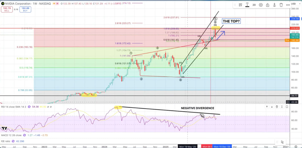 Bình luận: Dựa trên phương pháp sóng Elliott, nhà phân tích Henrik Zeberg cho rằng, ông Burry đã đúng khi bán khống Nvidia ngay tại tỷ lệ Fibonacci quan trọng cho sóng (5) là 1.618 lần, tương ứng mức giá 210 đôla. Có thể Burry hơi sớm một chút nhưng không sao, đỉnh cũng đang đến gần. Hồi năm 2007, Burry từng bán không sớm cả 1 năm (vào năm 2026). Burry sẽ đúng!