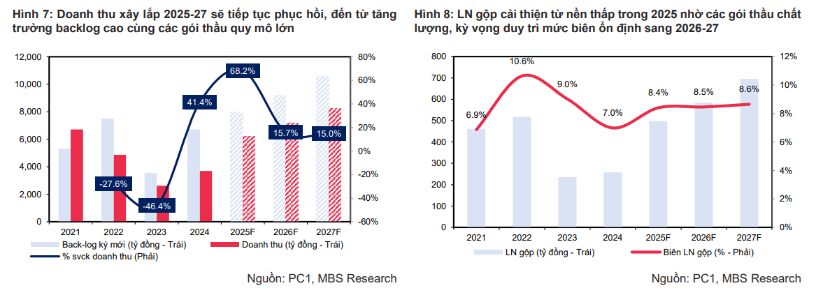 Doanh thu sản xuất công nghiệp năm 2025 đạt 1,499 tỷ đồng và tăng lên 1,982 tỷ đồng vào 2027. Mảng này hỗ trợ trực tiếp cho xây lắp nhờ cung cấp cột điện và thiết bị, đồng thời hưởng lợi từ xu hướng xây dựng đường dây và trạm biến áp trên toàn quốc. Biên lợi nhuận gộp dao động quanh mức 5-6%. MBS đánh giá mảng này sẽ có sự cải thiện từ quý IV/2025 nhờ các gói thầu cung cấp thiết bị cho dự án 500 kV Thái Bình – Hải Phòng, đồng thời mở rộng thêm dư địa tăng trưởng khi PC1 mở rộng nhà máy mới và thị trường xuất khẩu.