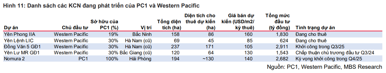 Mảng khu công nghiệp là điểm nhấn chiến lược của PC1 trong giai đoạn 2025-2028. Western Pacific, công ty liên doanh liên kết do PC1 góp vốn, sở hữu danh mục các dự án lớn gồm Yên Phong IIA, Đồng Văn 5, Yên Lư MR và Yên Lệnh, với tổng diện tích hàng trăm hecta. PC1 đồng thời đầu tư tự phát triển 100% dự án Nomura 2 quy mô khoảng 200 ha tại Hải Phòng. MBS nâng giá bán khu công nghiệp từ mức 120 USD/m^2/kỳ thuê lên 140 USD/m^2/kỳ thuê do xu hướng tăng giá mạnh ở Hải Phòng.