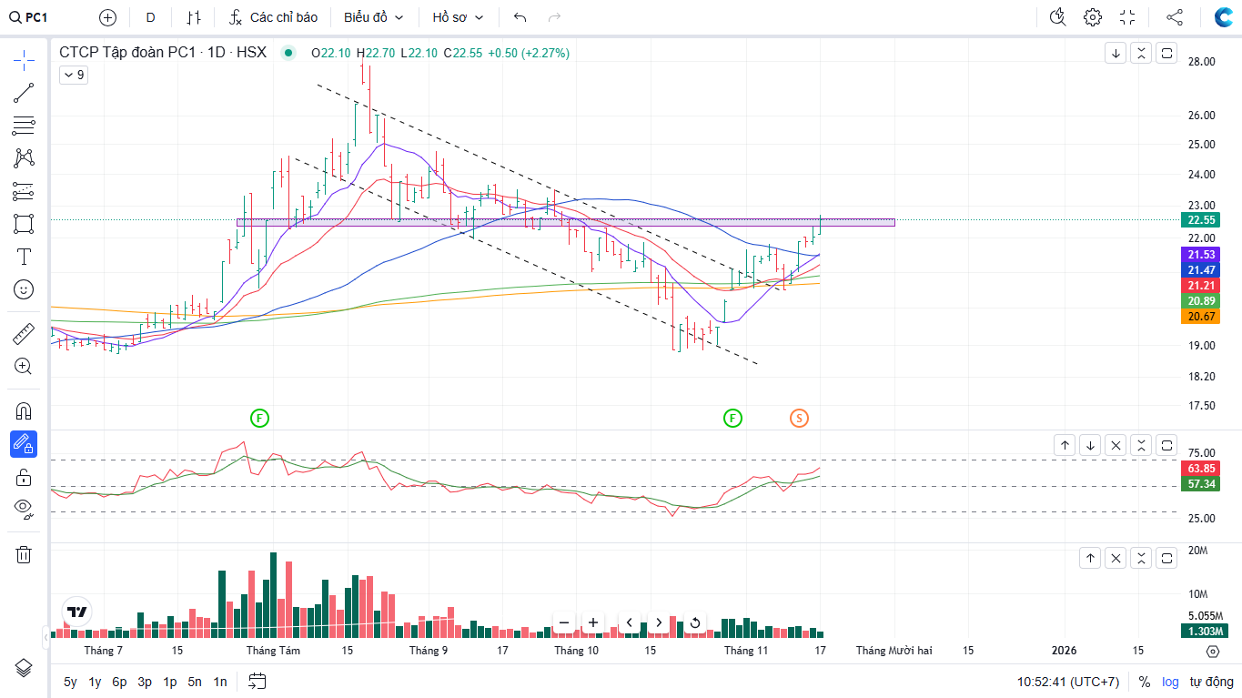 Trên biểu đồ kỹ thuật, PC1 có RS=42, mức hoạt động trung bình trên thị trường. Cổ phiếu đã bị điều chỉnh 33% từ đỉnh theo họ nhà Gelex, và hiện tại đang test lại vùng kháng cự quanh vùng giá 22,300 đồng. Biểu đồ của PC1 cũng khá ổn, nhà đầu tư có thể quan sát quanh giá 22,300-23,600 đồng. Nhóm điện admin thích REE, TV2 và REE. PC1 có thể bỏ vào danh mục quan sát.