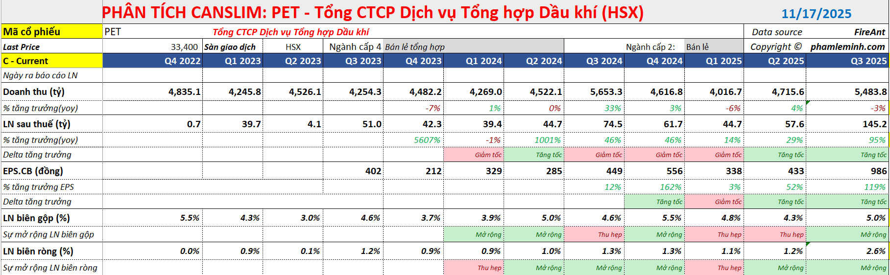 Trong Quý 3/2025, PET ghi nhận Doanh thu thuần (DTT) đạt 5,484 tỷ VND (-3% YoY) và Lợi nhuận sau thuế công ty mẹ (LNST) đạt 105 tỷ VND (+119% YoY).
