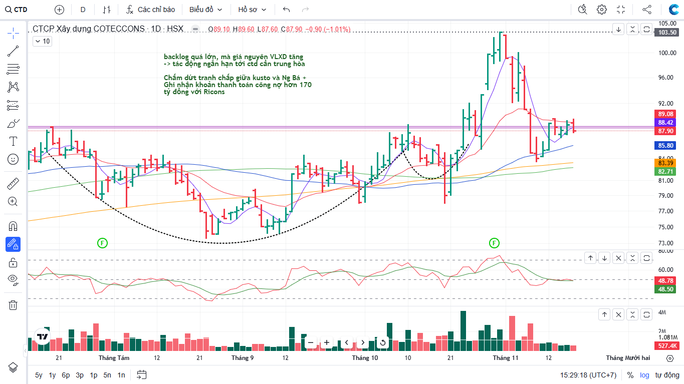Trên đồ thị kỹ thuật, CTD có RS=76, mức hoạt động tốt trên thị trường. CTD đã tìm được vùng hỗ trợ ở MA50 ngày, sau khi bị đè mạnh cùng với các cổ phiếu neo cao. Elibook Team giữ Trung Lập đối với cổ phiếu CTD, sau khi bán ra vào ngày 29/10/2025.