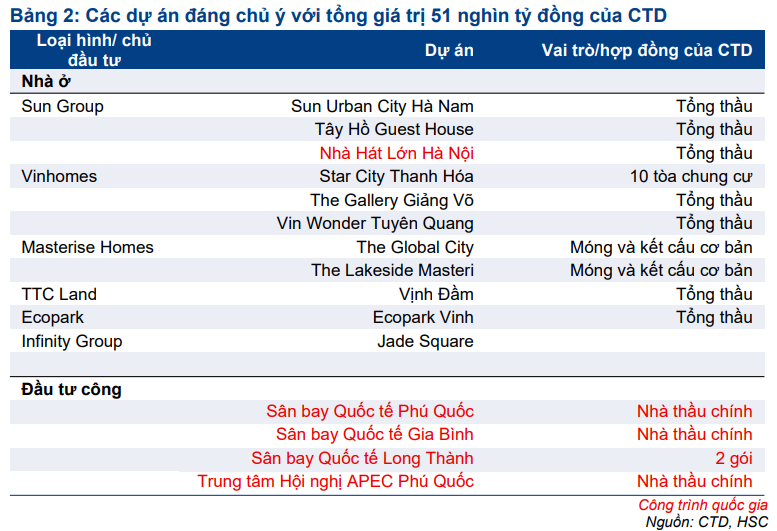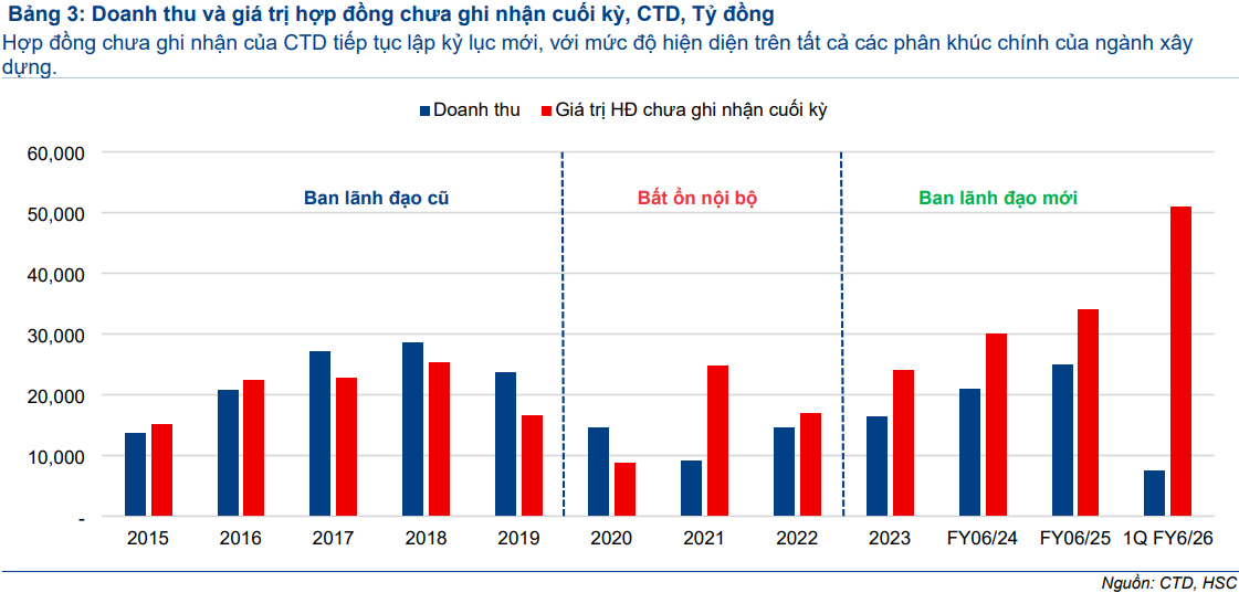 Nguyên nhân chính đến từ chiến lược đấu thầu mạnh mẽ nhằm gia tăng thị phần, đặc biệt trong bối cảnh CTD mở rộng hiện diện sang các dự án quy mô lớn của hạ tầng – đầu tư công. Tỷ suất lợi nhuận trong các dự án này thường chịu sức ép mạnh hơn so với các dự án dân dụng và công nghiệp truyền thống. Tuy vậy, HSC lưu ý khả năng tỷ suất lợi nhuận có thể vượt dự báo khi công tác kiểm soát chi phí tiếp tục được cải thiện.