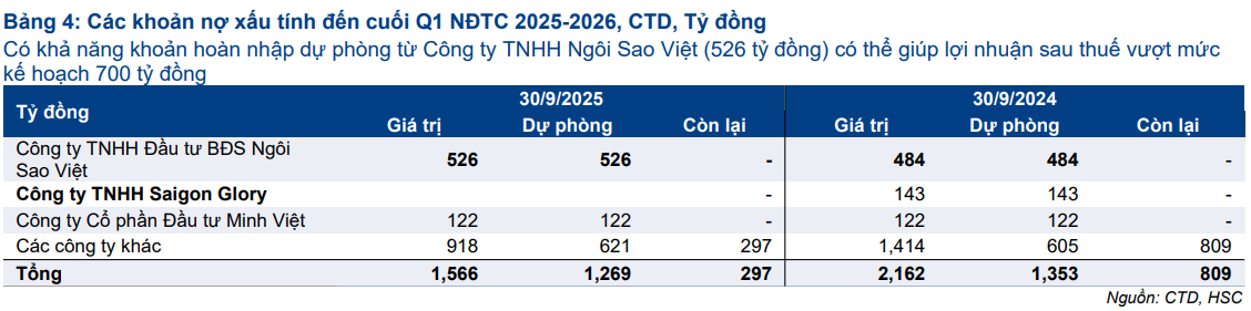 HSC nhấn mạnh khả năng hoàn nhập dự phòng từ các khoản này có thể tạo ra mức lợi nhuận vượt kế hoạch. Riêng Công ty Ngôi Sao Việt đang có khoản dự phòng 526 tỷ đồng và nếu phục hồi, đây sẽ là nguồn lợi nhuận đột biến. Tuy nhiên, do chưa rõ thời điểm và khả năng chắc chắn, HSC không đưa yếu tố này vào mô hình dự báo.