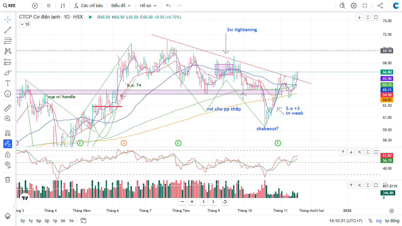 Trên đồ thị kỹ thuật, REE có RS=79, mức hoạt động tốt trên thị trường. Phiên hôm nay (18.11.2025), REE đã đủ thanh khoản để breakout tại điểm pivot gần nhất tại giá 66,000 đồng.