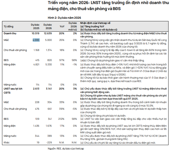 Vietcap dự báo doanh thu mảng cơ điện lạnh năm 2025 đạt 4,000 tỷ đồng và tăng lên 5,000 tỷ đồng năm 2026. LNST cổ đông công ty mẹ dự kiến đạt 228 tỷ đồng trong 2025 và 304 tỷ đồng trong 2026. Các dự án trọng điểm quốc gia như sân bay Long Thành, hệ thống hạ tầng công nghiệp, trung tâm dữ liệu và thương mại là nguồn việc làm lớn cho REE trong hai năm tới. Với biên lợi nhuận gộp duy trì khoảng 10%, mảng cơ điện giữ vai trò tạo dòng tiền và doanh thu ổn định, bổ trợ cho mảng điện vốn có biên lợi nhuận cao hơn.