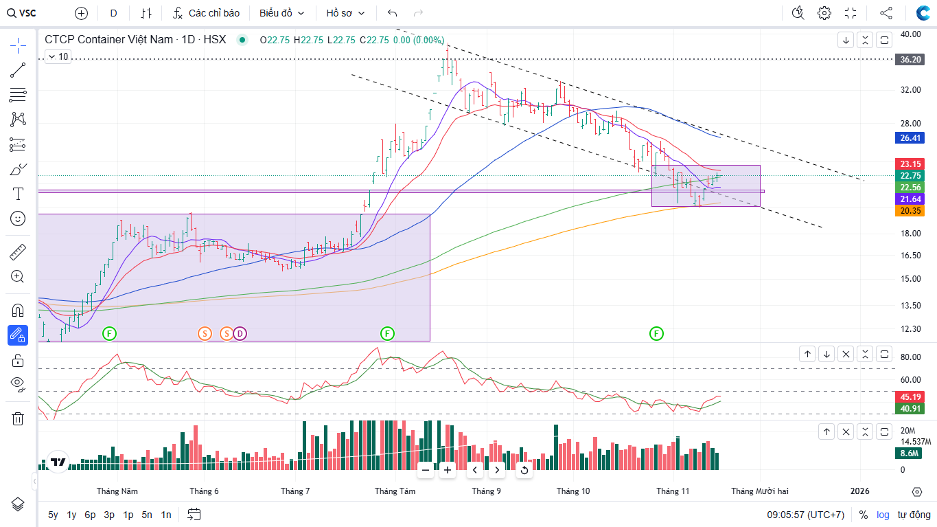 Trên biểu đồ kỹ thuật, VSC có RS=33, mức hoạt động thấp trên thị trường. Cổ phiếu đã tìm hỗ trợ ở MA200 ngày cùng với họ Gelex, khả năng xác nhận đáy tại giá 20,000 đồng. Tuy nhiên, VSC cần có thời gian để tích lũy trở lại và xử lý cung nhiều ở phía trên. Đối với nhóm vận tải – cảng biển, team ưu tiên đánh HAH.
