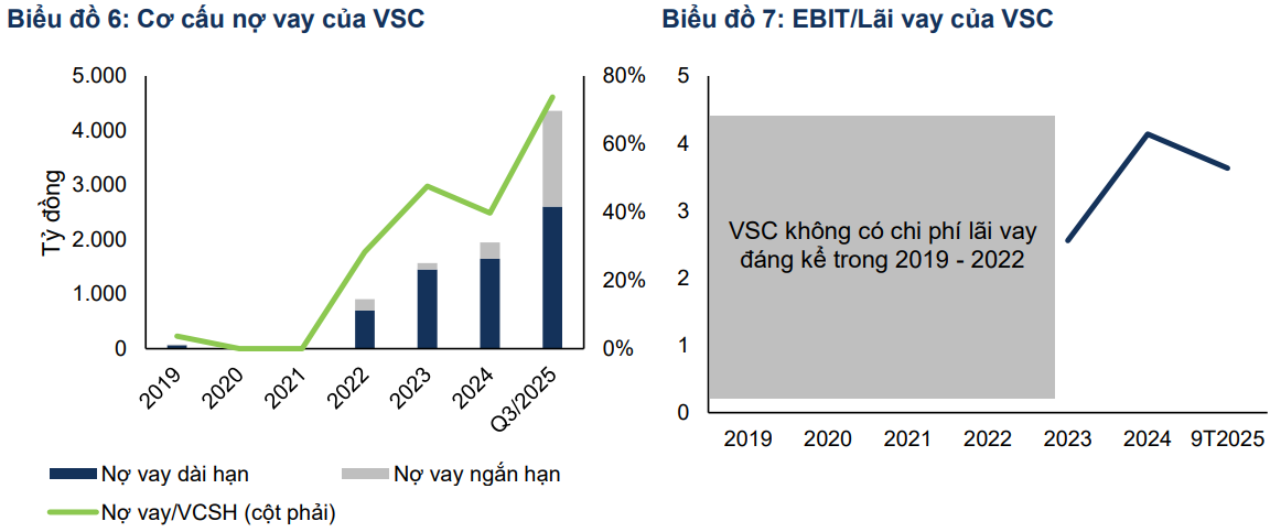 Tỷ lệ nợ vay trên vốn chủ sở hữu của VSC tăng đều từ 2022 đến 2025, đạt 73.8% vào cuối quý 3/2025. Nợ dài hạn chiếm gần 60% để tài trợ cho dự án cảng Nam Hải Đình Vũ. Nợ ngắn hạn cũng tăng đáng kể do phục vụ vốn lưu động và đầu tư chứng khoán. Tuy nhiên, khả năng chi trả lãi vay vẫn an toàn với hệ số EBIT/chi phí lãi vay đạt 3.6.