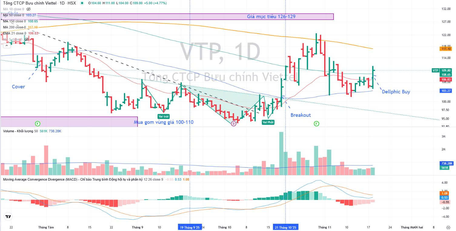 Ngày 18.11.2025, VTP có điểm mua Dellphic Buy. Trước đó, Elibook Team khuyến nghị mua gom VTP ở vùng giá 100-110,000 đồng. Kỳ vọng VTP sẽ vượt MA200 trong nhịp sóng này.