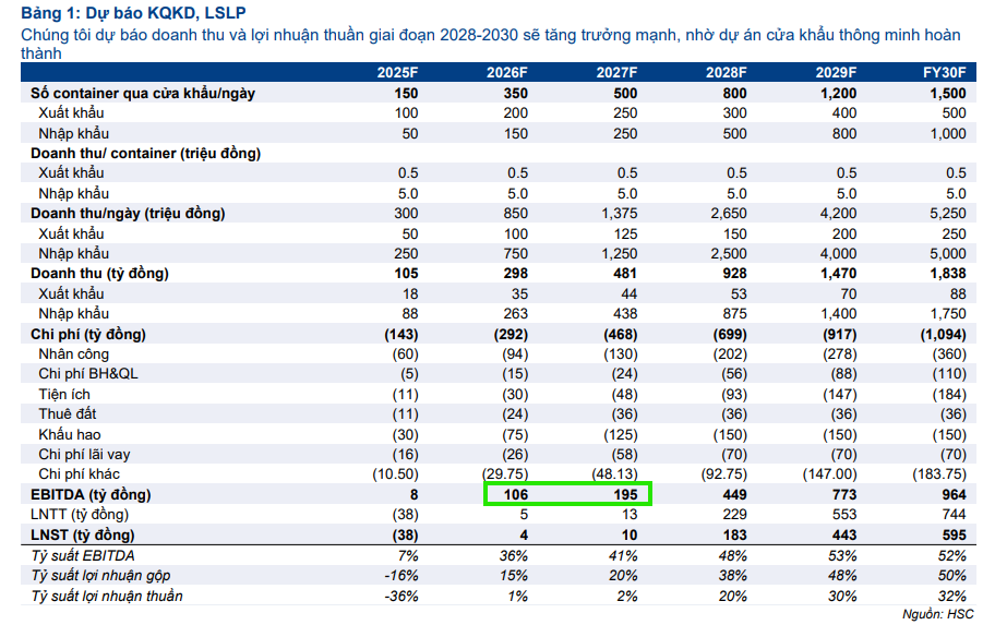 Tuy nhiên, điều đáng chú ý là ngay cả với sự điều chỉnh này, các dự báo mới vẫn cho thấy tăng trưởng lợi nhuận ròng ấn tượng 26% trong FY26 và 18% trong FY27. Quan trọng hơn, từ năm FY28 trở đi, doanh thu và lợi nhuận từ LSLP dự kiến sẽ tăng mạnh mẽ khi dự án cửa khẩu thông minh hoàn tất.