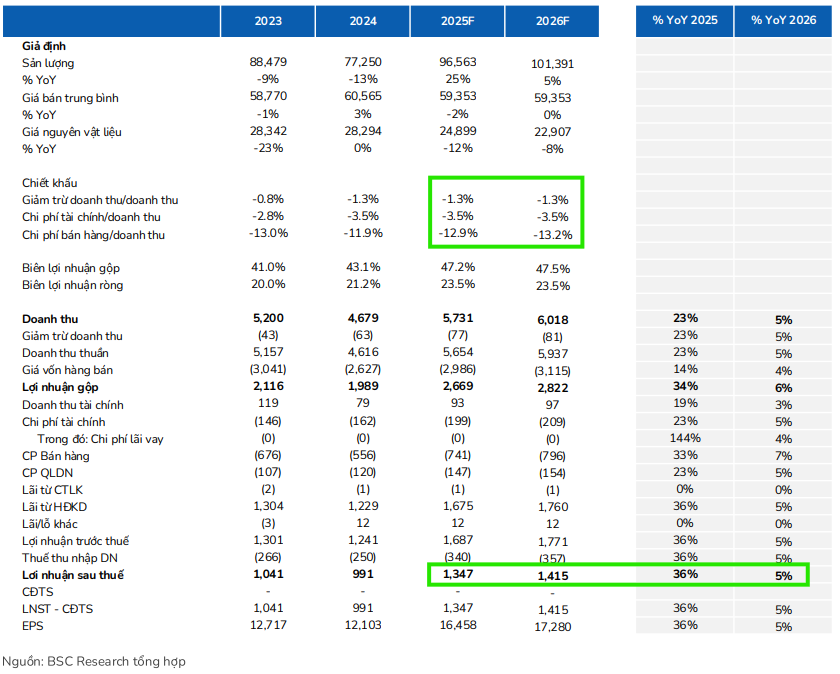 Triển vọng 2026 khả quan nhưng có khác biệt giữa các CTCK: VDSC dự báo lợi nhuận thuần đạt 1,456 tỷ VND (+10.6% YoY) với biên gộp 47.1% và sản lượng phục hồi lên 95 nghìn tấn. BSC thận trọng hơn, dự báo LNST đạt 1,415 tỷ VND (+5% YoY), nhấn mạnh áp lực chiết khấu để giữ thị phần.