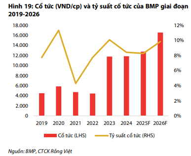 BSC cũng kỳ vọng tỷ suất cổ tức cao sẽ được duy trì trong giai đoạn 2025 – 2026, với mức cổ tức trả cho năm 2025 (trả vào năm 2026) là 17,000 VNĐ/cổ phiếu, tương đương tỷ suất 10%. Điều này làm cho BMP trở thành lựa chọn phù hợp cho chiến lược đầu tư cổ tức.