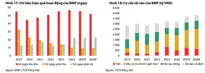 Kể từ năm 2020, BMP duy trì một tỷ trọng khá lớn (30-60% tổng tài sản) tiền và đầu tư tài chính ngắn hạn (tiền gửi ngân hàng) trong cơ cấu tổng tài sản. Tính đến cuối quý 3/2025, BMP đang có khoảng 2,700 tỷ VND tiền mặt, trong đó 1,900 tỷ VND tiền gửi kỳ hạn ngắn đang hưởng mức lãi suất từ 4-5%/năm. VDSC kỳ vọng lượng tiền gửi ngân hàng này sẽ tăng lên 2,300 tỷ VNDđến cuối năm 2026 với giả định công ty không có kế hoạch đầu tư lớn trong ngắn hạn và sẽ phân phối 99% lợi nhuận sau thuế mỗi năm để trả cổ tức tiền mặt cho cổ đông.