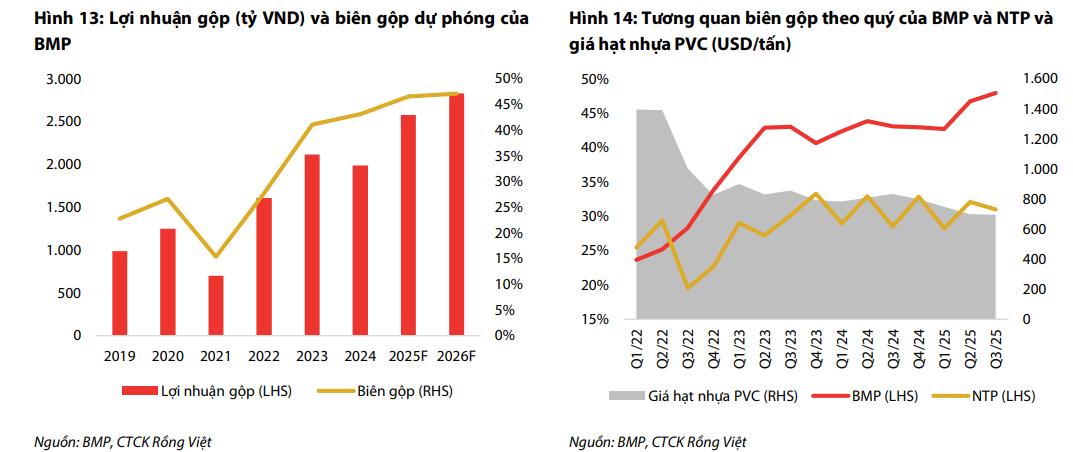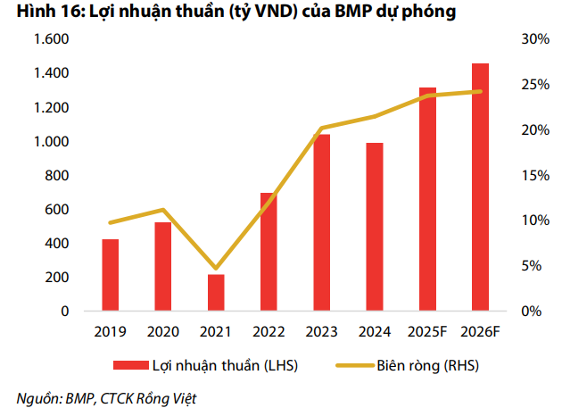 VDSC kỳ vọng biên lợi nhuận gộp sẽ đạt 47.1% trong năm 2026 và lợi nhuận thuần cổ đông công ty mẹ đạt 1,456 tỷ VNĐ, tăng 10.6% so với năm 2025. VDSC đánh giá BMP là doanh nghiệp có hiệu suất sinh lời nổi bật nhất trong ngành.