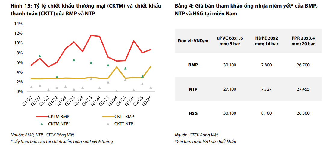 Kết thúc quý 3 năm 2025, BMP ghi nhận Doanh thu thuần đạt 1,554 tỷ VNĐ, tăng trưởng 9% so với cùng kỳ năm trước, và Lợi nhuận sau thuế cổ đông công ty mẹ (LNST – CĐTS) đạt 351 tỷ VNĐ, tăng 21% so với cùng kỳ. Theo BSC, động lực tăng trưởng lợi nhuận chủ yếu đến từ việc Biên lợi nhuận gộp đạt mức ấn tượng 47.2%, tăng 4.6 điểm phần trăm so với cùng kỳ, nhờ giá hạt nhựa PVC đầu vào giảm mạnh. Mức cải thiện biên lợi nhuận này đã bù đắp hoàn toàn cho việc BMP phải tăng chiết khấu giá bán và chi phí bán hàng để đẩy sản lượng tiêu thụ, vốn đã tăng 8% so với cùng kỳ. Tổng tỷ lệ chiết khấu, bán hàng trên doanh thu đã lên tới 19.7%, là mức cao nhất trong 5 năm gần đây của BMP, cho thấy áp lực cạnh tranh và nguy cơ mất thị phần đang hiện hữu, đặc biệt trong bối cảnh quý 3 là mùa thấp điểm.